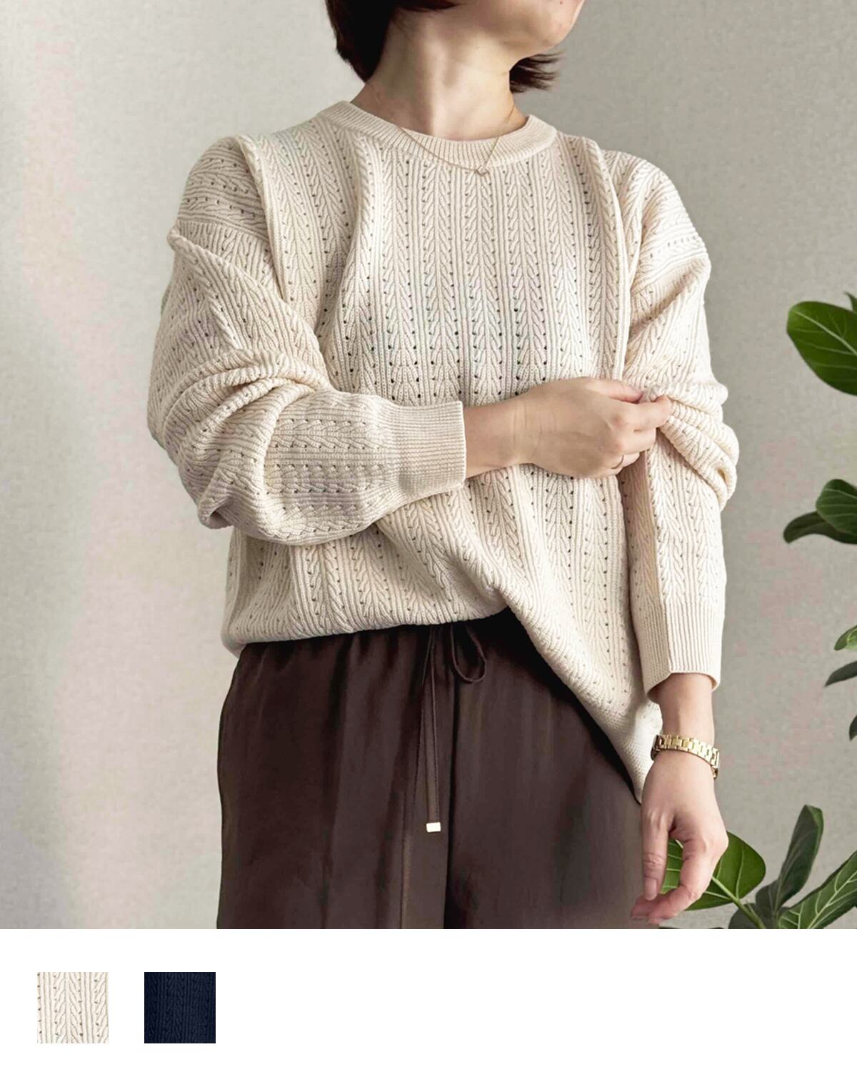 編み模様に透け感がありますので冬だけでなく春先も着やすいです。