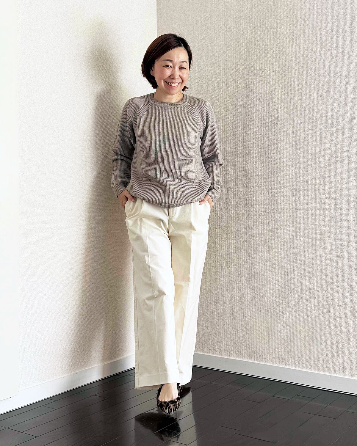 冬になると穿きたくなるような優しい色味のオフホワイです。