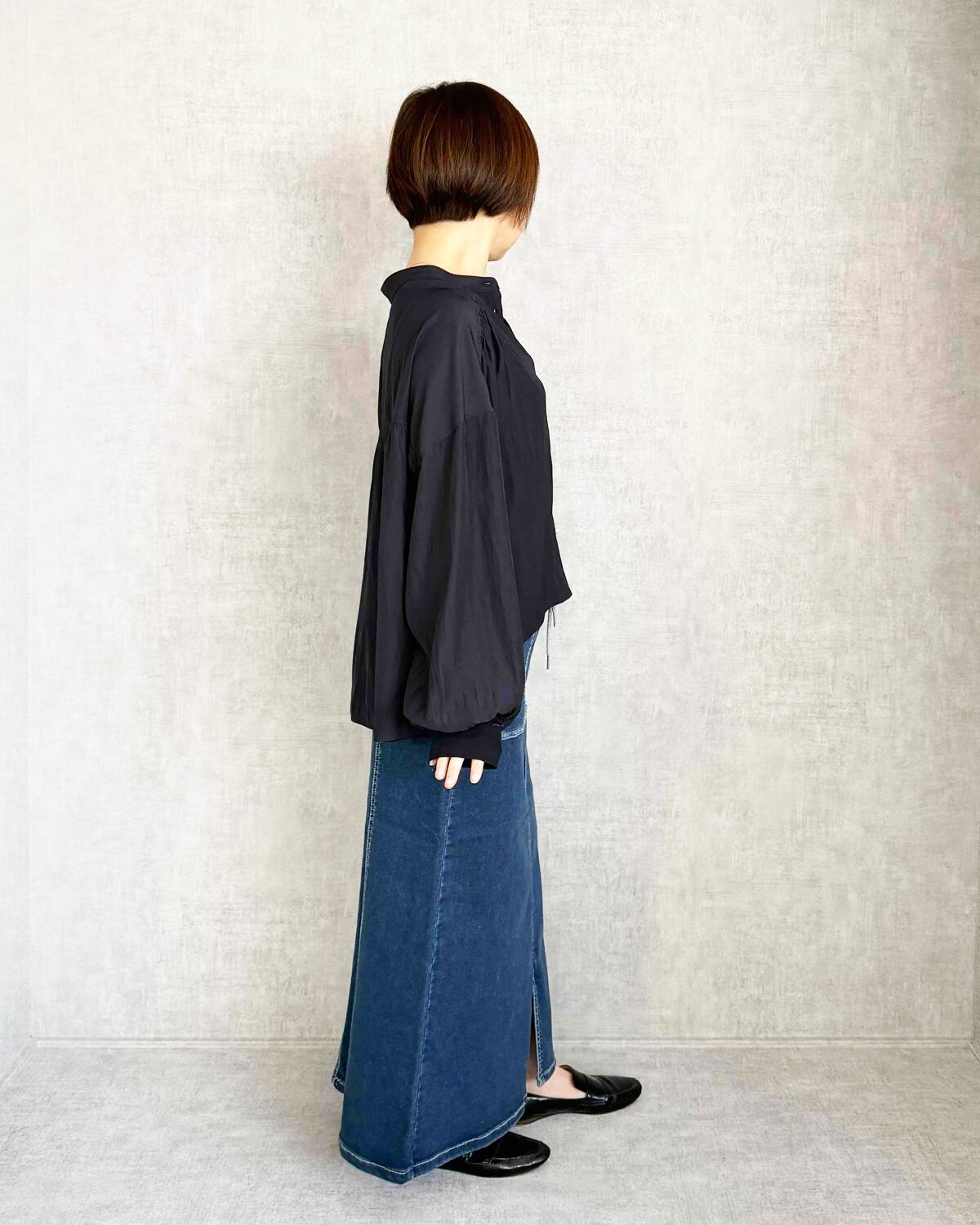 ・ネイビーのブラウスと合わせているスカート(デニム)