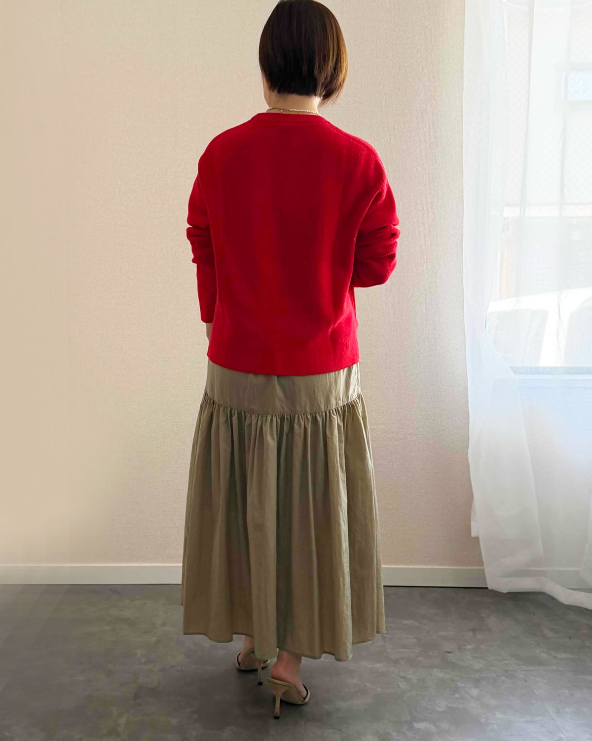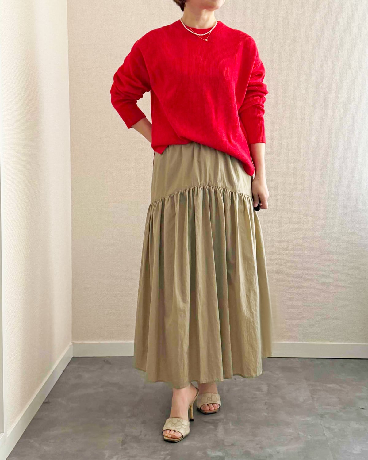 redと合わせているスカート(ベージュ)