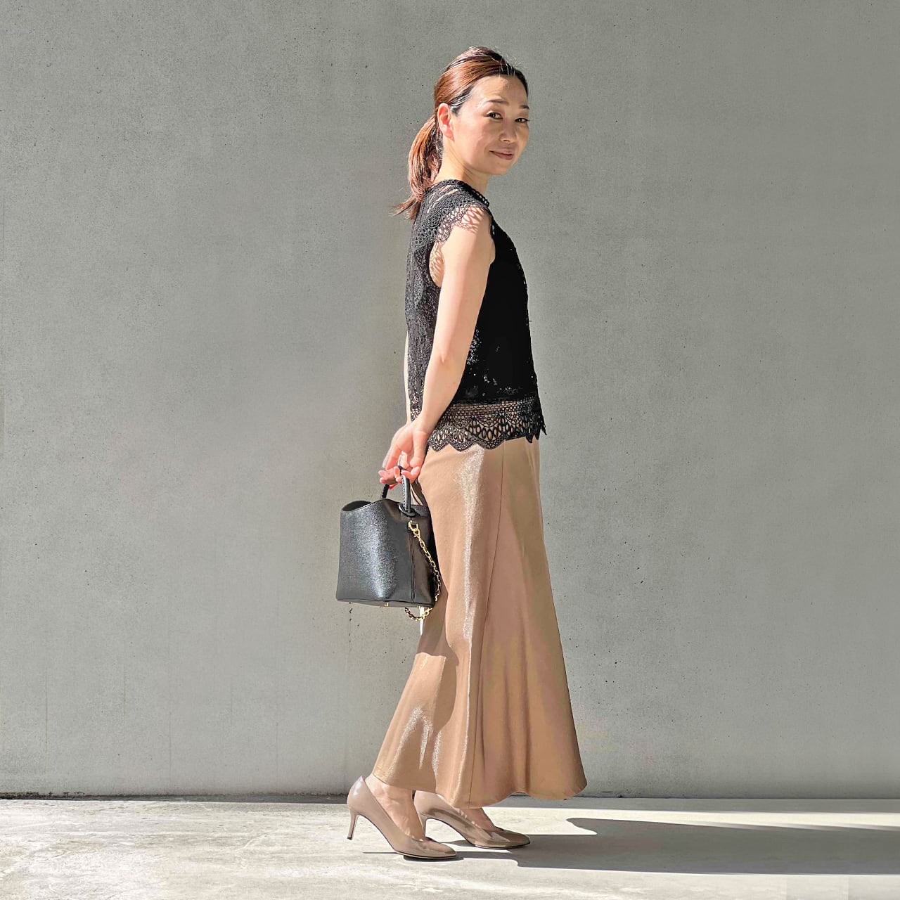 裾のドレープ感が美しく、女性らしい雰囲気です。