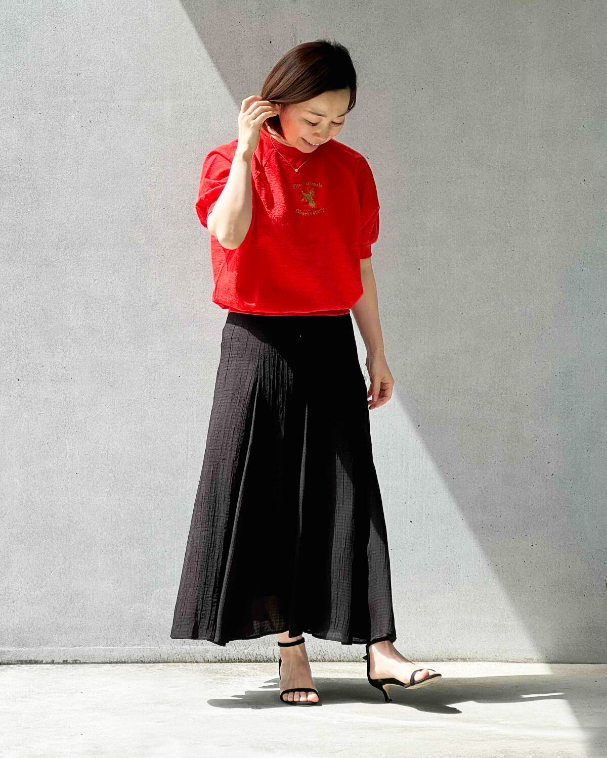 ブラックに合わせている半袖カットソー(レッド)